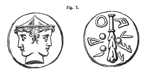 Now, first this decisively shows that Chaos was known not merely as a state of confusion, but as the "god of Confusion." But, secondly, who that is at all acquainted with the laws of Chaldaic pronunciation, does not know that Chaos is just one of the established forms of the name of Chus or Cush? * Then, look at the symbol of Janus, Fig 7 ** whom "the ancients called Chaos," and it will be seen how exactly it tallies with the doings of Cush, when he is identified with Bel, "The Confounder." That symbol is a club; and the name of "a club" in Chaldee comes from the very word which signifies "to break in pieces, or scatter abroad." ***