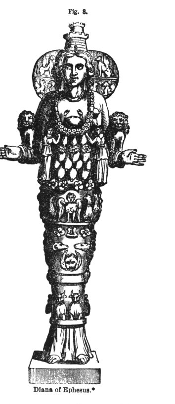 When we look at the Ephesian Diana, we find evidence to the very same effect. In general, Diana was depicted as a virgin, and the patroness of virginity; but the Ephesian Diana was quite different. She was represented with all the attributes of the Mother of the gods (Fig 8) , and, as the Mother of the gods, she wore a turreted crown, such as no one can contemplate without being forcibly reminded of the tower of Babel. Now this tower-bearing Diana is by an ancient scholiast expressly identified with Semiramis. *