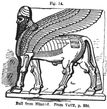 The meaning of this name Kronos, "The Horned one," as applied to Nimrod, fully explains the origin of the remarkable symbol, so frequently occurring among the Nineveh sculptures, the gigantic HORNED man-bull, as representing the great divinities in Assyria. The same word that signified a bull, signified also a ruler or prince. *